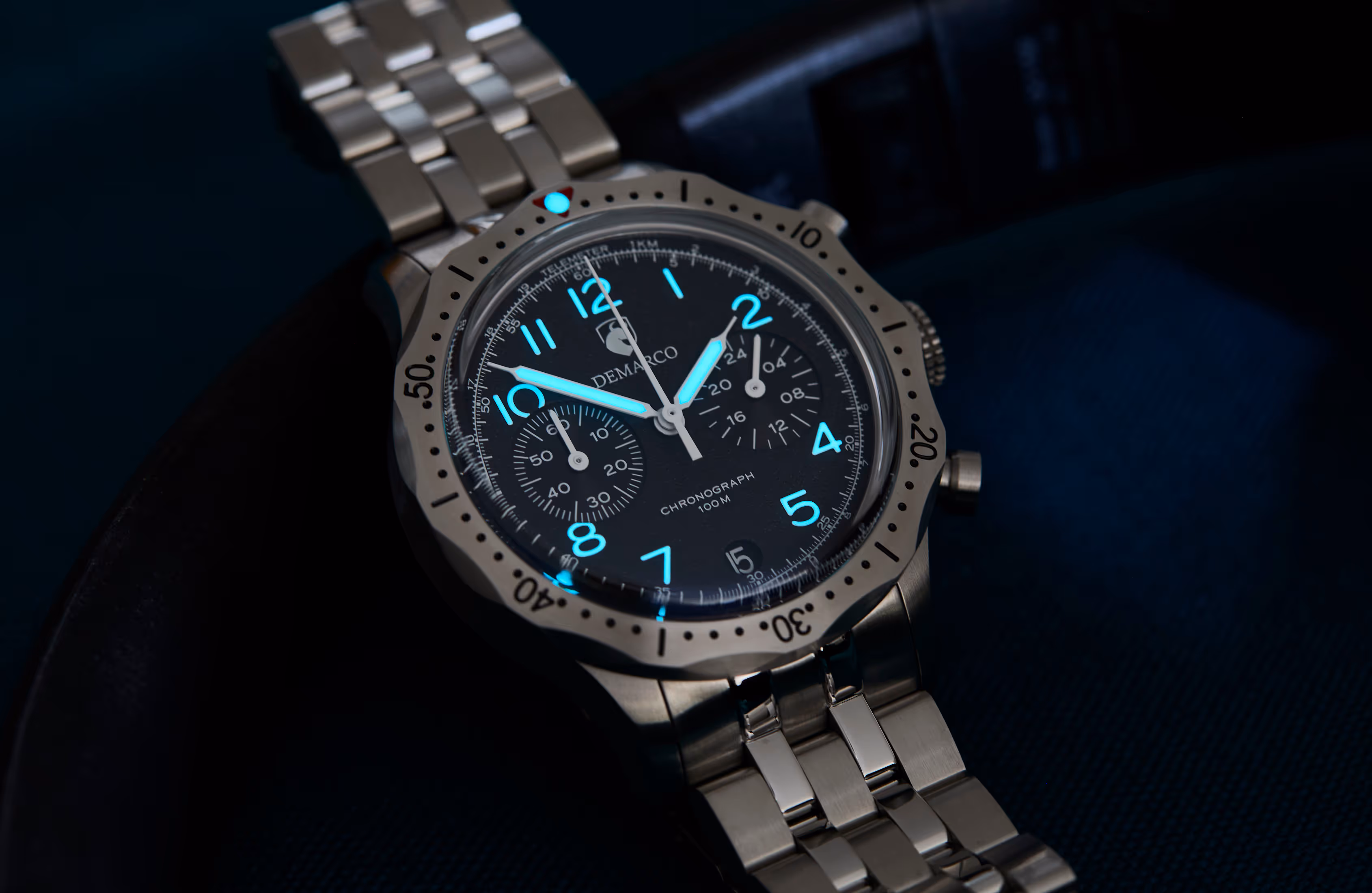 Discover our new Chronograph Watch, meticulously crafted from 316L stainless steel. Engineered with a mechaquartz movement, this timepiece blends the reliability of quartz with mechanical precision. With its rotating bezel, luminous hands, and water resistance, it's the perfect companion for any adventure. Elevate your style and performance with the DeMarco Chronograph Watch.