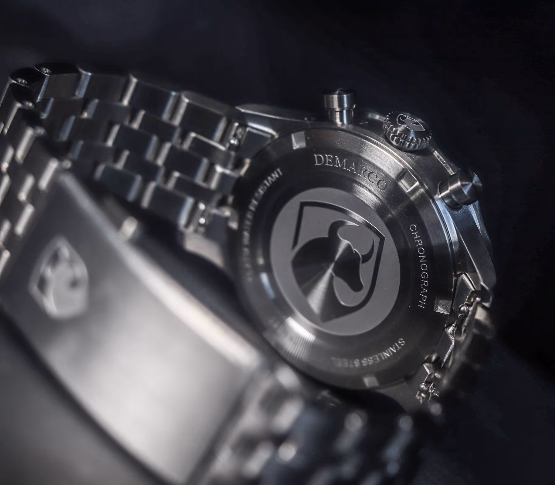 Machined from corrosion-resistant 316L stainless steel, our 41mm case is built for durability and balance. A mix of brushed and polished surfaces gives it a refined, tool-ready finish. The case back is engraved, not stamped — a lasting detail that marks it as unmistakably DeMarco.